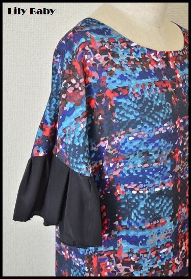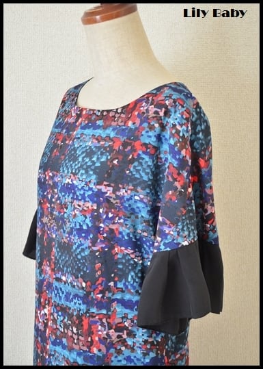 ドロップショルダーの袖にはバイカラーのギャザー袖がふんわり。