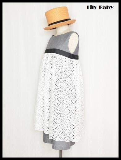 ダンガリーのワンピースにコットンカットワークレースを重ねた涼しげなワンピースです。胸元には黒のグログランリボンをアクセントにして上品な仕上がりになってます。ダンガリーはブラックなので甘くなりすぎず大人可愛い雰囲気に。バックはアイコンの見せZIP&リボン。ふんわりしたカットワークのフォルムと透け感が軽く爽やかなサマードレスです。